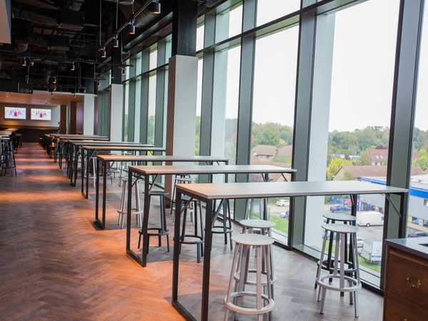 The Clubhouse Bar & Kitchen makes up one half of The Clubhouse, situated on level 4 of the new East Stand. Touches of warm wood, leather and metallic finishes complete this light and airy facility which features predominantly open ceilings and an open plan area that is ideal for drinks receptions for up to one thousand guests, or smaller exhibitions and showcases.